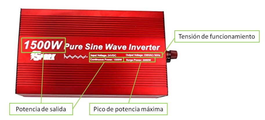 La potencia de salida de los inversores de corriente viene dada en vatios (W) o vatioamperio (VA). Estos valores nos los dará el fabricante del inversor, y normalmente, está impreso en el cuerpo del propio convertidor de corriente alterna.